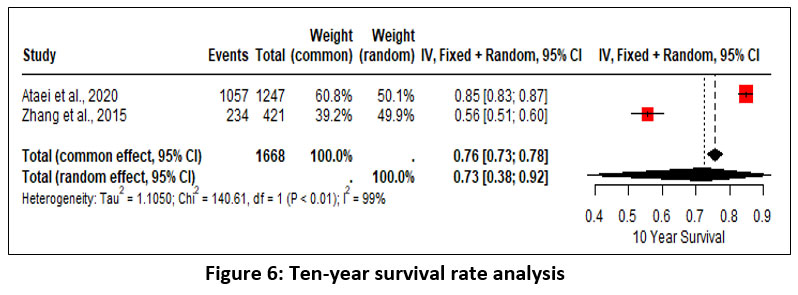 For the 10-year survival rates, 2 studies were analyzed, which resulted in an overall survival rate of 73% (random effect; 95% CI 38 – 92%; heterogeneity; 𝜏2 <0.01; I2 = 99%) (Figure 6).
