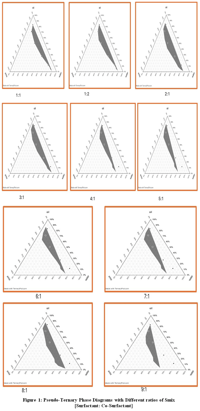 Figure 1: Pseudo-Ternary Phase Diagrams with Different ratios of Smix [Surfactant: Co-Surfactant]