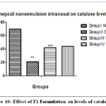 Animals treated with scopolamine had lower catalase levels (21.76±13.90) as compared to controls. Scopolamine + Donepezil-treated animals had higher catalase levels (44.85±8.65) compared to scopolamine-treated animals. Animals treated with Scopolamine + F1 Donepezil nanoemulsion intranasally had significantly higher catalase levels than scopolamine-treated animals. Based on these findings, F1 Donepezil nanoemulsion significantly increases catalase levels (42.55±4.42). Results were shown in Figure 10.