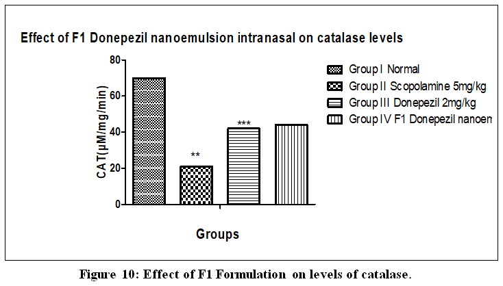 The values were expressed in terms of mean ± SEM. Animals treated with scopolamine showed significantly reduced levels of catalase (** p< 0.001) in comparison to the normal control group. Scopolamine + Donepezil and Scopolamine + F1 Donepezil nanoemulsion intranasal treated animals possess significantly greater catalase values (***p<0.001) than the Scopolamine treated group.