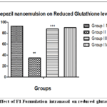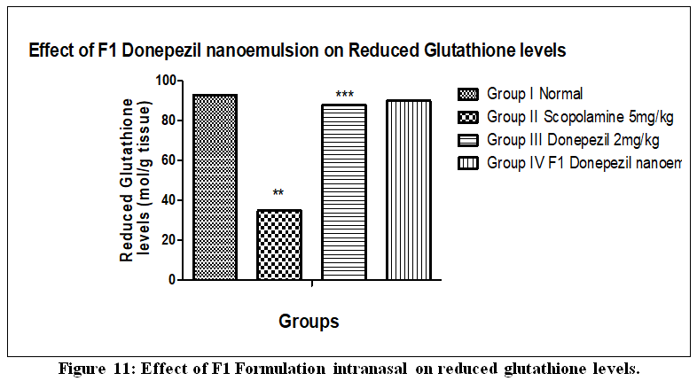 Scopolamine-treated animals have lower Reduced Glutathione levels (35.36±1.21) compared to the control group. Scopolamine + Donepezil-treated animals have higher Reduced Glutathione levels (90.1±0.18) compared to scopolamine-treated animals. Scopolamine + F1 Donepezil nanoemulsion intranasal-treated animals have significantly higher reduced Glutathione levels than scopolamine-treated animals. Based on the results, F1 Donepezil nanoemulsion intranasal significantly increases the Reduced Glutathione levels (88.9±0.98). The results were shown in Figure 11.