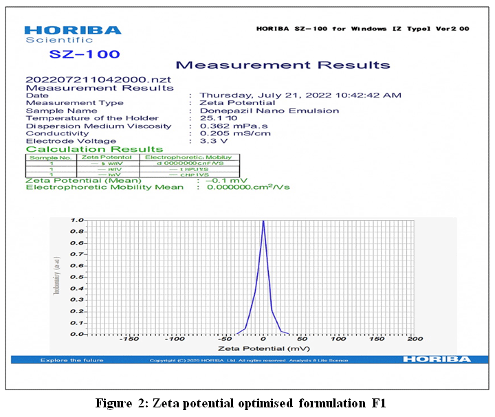The in vitro release profile of DPZ-NE adhered to Higuchi kinetics, suggesting a diffusion-driven release mechanism. In contrast to traditional Donepezil solutions, the nanoemulsion exhibited a more prolonged and controlled release, which could potentially improve therapeutic outcomes by sustaining drug concentrations in the brain. Additionally, the nanoemulsion’s enhanced permeation across the nasal mucosa was further validated by zeta potential analysis and its pseudoplastic characteristics, both of which promote improved mucosal adhesion and absorption.