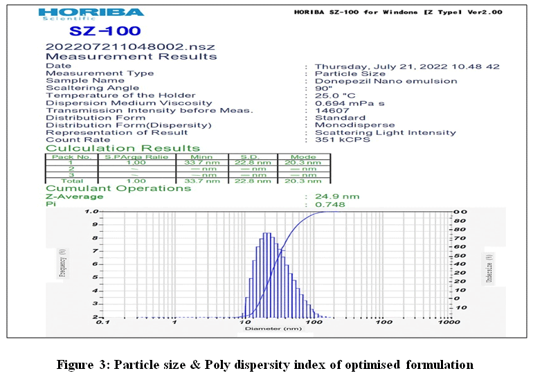 Donepezil hydrochloride solubility was carried out on oils, surfactants & co-surfactants. Considering solubility, oleic acid was utilised as the oily phase, while PEG 400 served as the co-surfactant & Tween 80 as surfactant (Table 2).