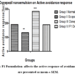 Animals in the scopolamine-treated group(GroupII) showed impaired performance in the active avoidance test. Treatment with Scopolamine + Donepezil(groupIII) and Scopolamine + F1 intranasal formulation(GroupIV) significantly improved active avoidance response, as evidenced by a significant reduction in avoidance latency (sec) compared to the scopolamine group (***p < 0.001).